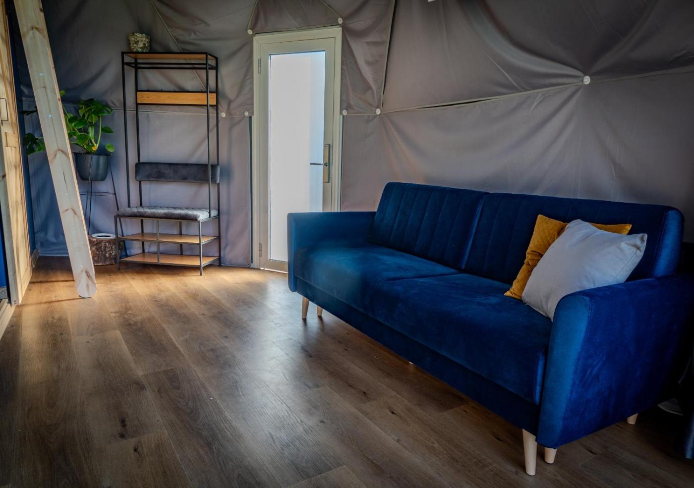 Namiot. Guests will find a stovetop, a refrigerator, kitchenware and a microwave in the well-fitted kitchen. The tent also provides guests with a barbecue. This air-conditioned tent includes a flat-screen TV with streaming services, a private bathroom as well as an outdoor dining area. The unit offers 3 beds. Namiot - 6 osobowy. Powierzchnia pokoju ok.: 48 mkw.